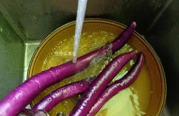 1.准备好的茄子放在盘中,用清水冲洗干净。洗净后茄子放在一旁备用;