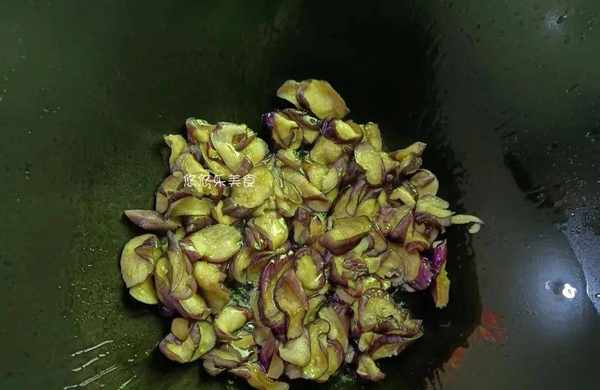 7.准备一个干净的锅,锅中的水分干后,倒入适量的油。倒入洗净的茄子,用铲子将它们翻炒均匀;