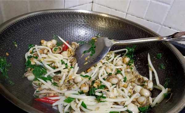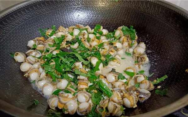 5、热油锅中,放入准备好的姜片、蒜米、爆香,然后将红螺肉倒入锅中用大火一起爆炒,加入少许料酒翻炒2分钟,再加入假蒌叶拌炒均匀。