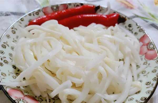 2、将自家腌的酸笋取出小部分的酸笋,(酸笋是自己家用新鲜甜笋腌制的,口感清脆,带有微微的酸味),同样用清水洗干净,然后备2个小辣椒装盘待用。