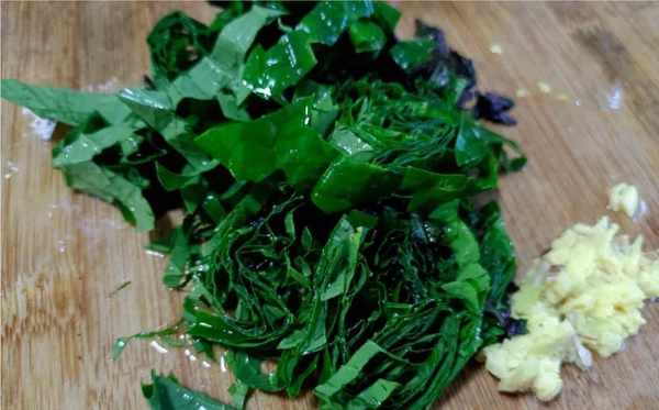 3、将假蒌叶、蒜米和姜洗干净切碎待凋味使用(假蒌叶是一种植物调料味,炒红螺肉配一些假蒌叶可以去腥及增加香味)