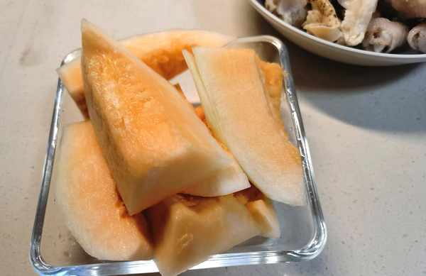 3.哈密瓜切开后取一半,只取靠近瓜皮部分不太熟的瓜肉煲汤,剩下的部分可以做一份水果盘。