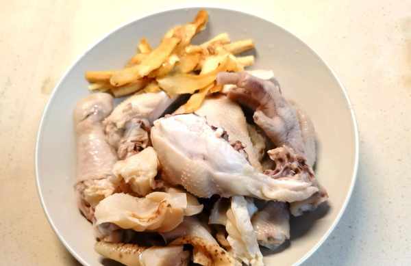2.把鸡切成大块,然后和泡发好的响螺一起焯一下水,冲洗干净以后备用。