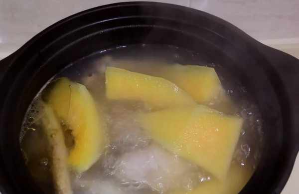 4.烧一锅开水,把除了哈密瓜以外的所有材料放进去,水开以后调成小火,煲半个小时,然后把哈密瓜放进去再煲半个小时即可。
