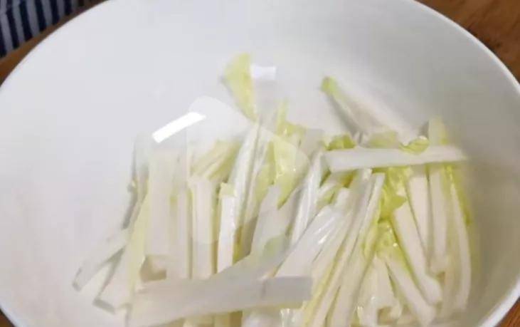 2:把娃娃菜洗净,然后把娃娃菜切成七八厘米长,一厘米宽的细条备用。