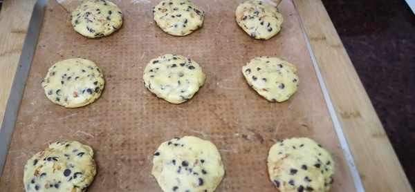 ⒍放置一个小时后,面团有点硬了。用小勺挖出50克的小面团,轻轻揉圆并稍微按扁,放入烤盘。