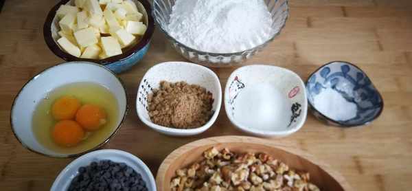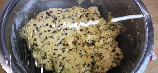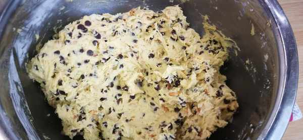 ⒋加入巧克力豆和核桃仁,翻拌均匀。这时候面团的状态是非常软的状态。