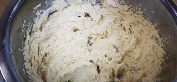 ⒉黄油放入盆中,加入细砂糖、黄棕糖用刮刀搅拌均匀然后用打蛋器打发黄油并分次加入鸡蛋打发,打发至黄油糊呈轻盈的状态。