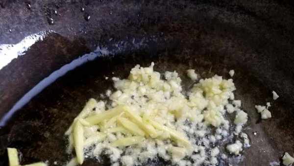4、锅中加入适量食用油,油热后将姜末、蒜末一起倒入锅中,快速翻炒出香味,最好将蒜炒至微微金黄,这个时候是最香的,然后将处理好的花甲下锅爆炒。