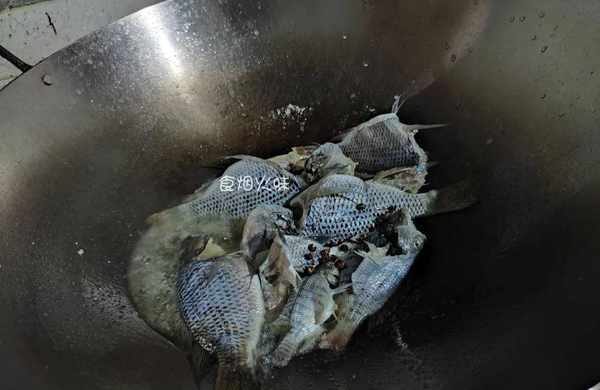 3.这些鲫鱼是事先就处理好的,要吃就拿出来煮即可。鲫鱼处理的时候要将里面的黑色膜去掉,随后将其肚子里面要清洗干净。锅中的水分干后,倒入适量的油,撒入食盐,将洗净的鲫鱼放入锅中,随后不要动。放着煎煮,煮的过程中不要翻动,底下煎好再翻面。煎煮的时加入适量的花椒,花椒有去腥提鲜的好处;
