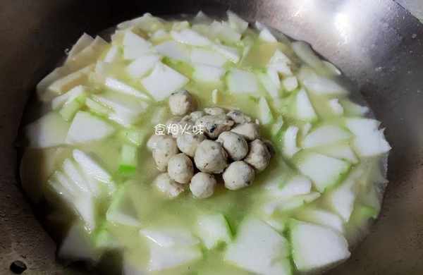 7.随后也把冬瓜片倒入,丸子用清水洗净后也一同倒入锅中,随后盖上盖子煮开;