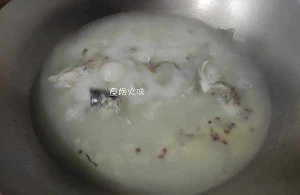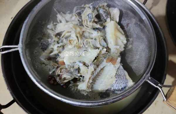 5.鱼汤炖好后,准备一个干净的漏勺,将鱼捞出,只需要鱼汤即可;