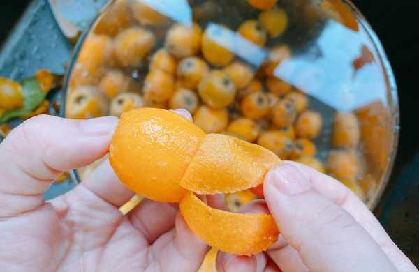 5、枇杷去皮有小妙招,用勺子顺着枇杷的表皮,从上往下刮,整个枇杷都刮一遍,开始剥皮,可以看见剥下来的皮很完成,去皮就变得简单了,去皮之后,直接对半剥开,去掉枇杷核;