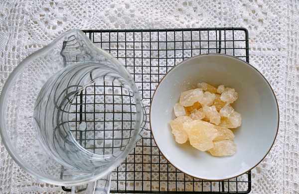 7、再准备适量的清水和冰糖,500g清水中加入大约80g冰糖,这个比例的糖水,甜度是刚好的,用清水和冰糖来调比例,这个糖水的口感会更精确,至于清水用量的多少就可以根据自己的喜好选择,喜欢糖水多一些的,可以多加一点清水,冰糖的用量也随之增加,如果枇杷口感偏酸的可以可以稍微多加一点冰糖,多增加20g左右,用冰糖煮止咳化痰、清热降火的效果会更好,不能用白砂糖代替;