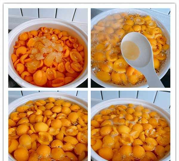 8、砂锅中加入准备好的清水和冰糖,加入枇杷,大火煮开,转小火,表面有浮沫的要撇去表面的浮沫,煮到枇杷果肉有些有些变软,颜色变淡,大约10-15分钟,关火出锅;