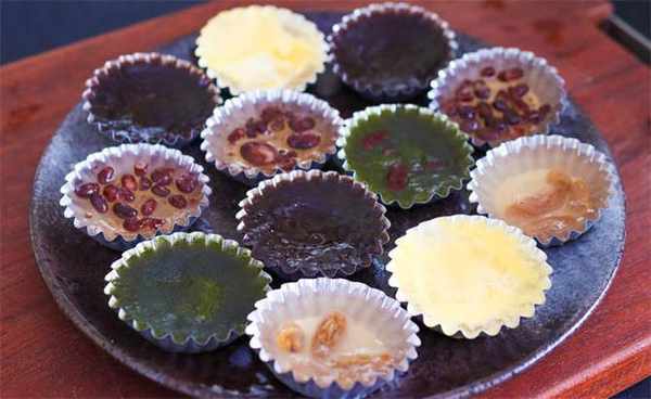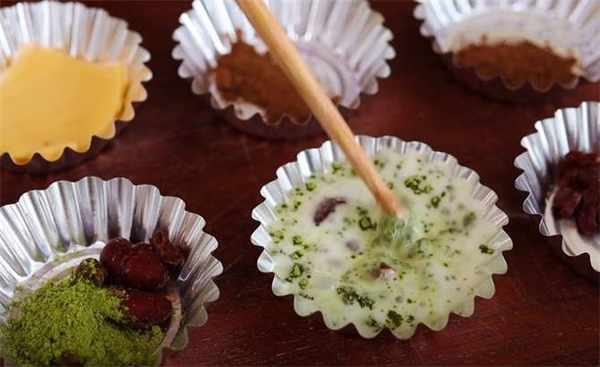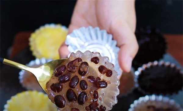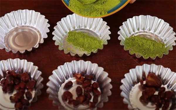 3.家里面没有专门的模具,咱们可以用这种锡纸盏来代替,在底部铺一些葡萄干,第二排我们可以放一些熟的红豆,大家也可以做一些其他口味的,比如说像我这样放一些抹茶粉。