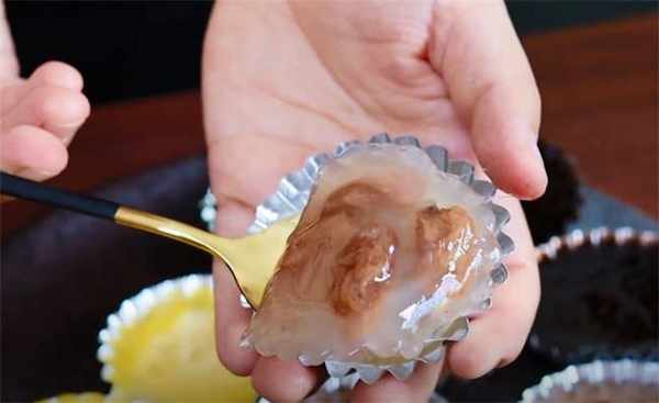6.咱们的钵仔糕就做好了,我用的这个锡纸模具比较软,不容易脱模,咱们脱模的时候直接用勺子这样铲出来。