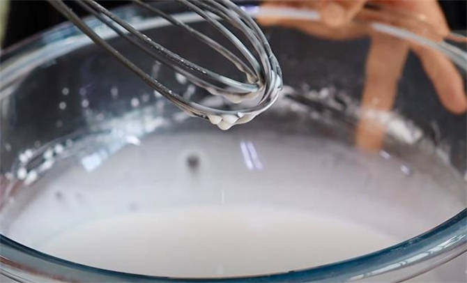 1.做钵仔糕需要两种粉,这个是马蹄粉放上150g,另外一种是木薯淀粉也放150g,再准备上300g的清水,咱们边倒边搅拌,最后我们一直搅拌成比较细腻的呈流水线的牛奶状。