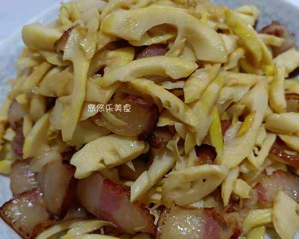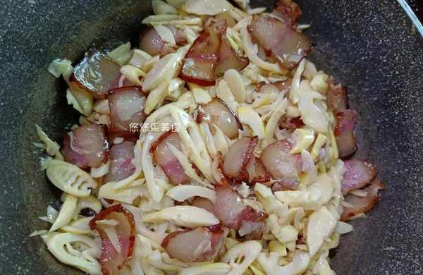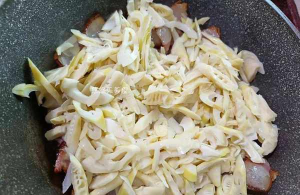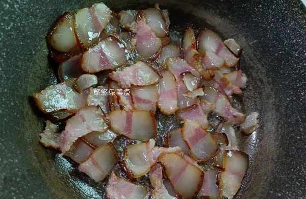 3.笋跟腊肉是绝配,腊肉先下锅将其多余的油脂煸炒出来,再下锅炒。