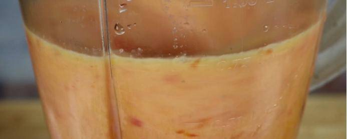 3、接下来处理咱们准备好的鸡蛋,将鸡蛋清洗一下,然后在番茄碎丁中打入4个鸡蛋,打入鸡蛋之后咱们将它们全部放入到榨汁机中打成汁,然后放到一个大碗中,因为番茄鸡蛋打完汁之后表面会有许多浮沫,所以咱们需要将浮沫用勺子撇去。