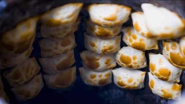 天刚亮,馕坑生火,一个个包子填入洋葱、羊肉馅,折叠成四方形的包子,待包子一个个鼓起来以后就可以取出来啦。热腾腾的烤包子皮酥肉美,金黄瓦亮。