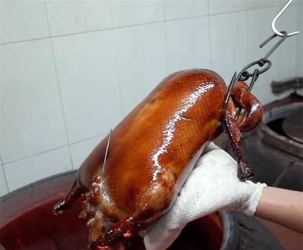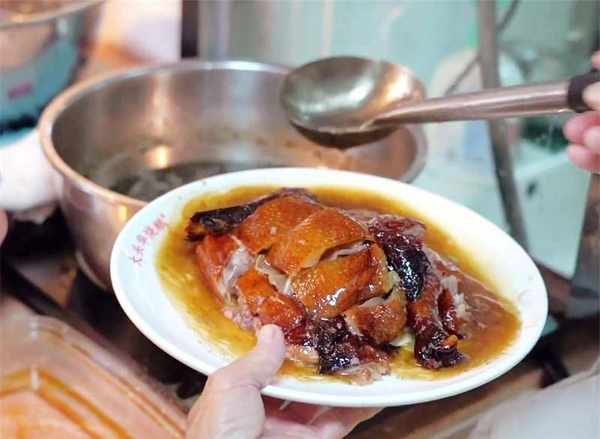 店里的烧鹅都是现烤现切的,腌好的烧鹅加入秘制料包入大锅中烘烤,烤制出来的皮质枣红色的,油亮亮的闪闪发光,上面滋滋的热油还冒着小气泡,到店门外很远地方就能闻到香喷喷的烧鹅气质了,员工说店里的烧鹅都是顾客购买了再从烤炉里取出来,然后破边砍开或者顾客整只带走,这样能保持烧鹅肉质吃起的口感。
