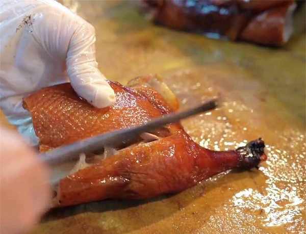 破边的烧鹅里边喝出的汤汁味很浓郁,切掉头尾,破边,然后再切成小块,师傅的刀工很厉害,基本都是一刀一块,一丁点拖沓的都没有,砍出来的烧鹅块均等分,几乎没有破烂的,烧鹅可以整只售卖,也可以半只或者四分之一卖。