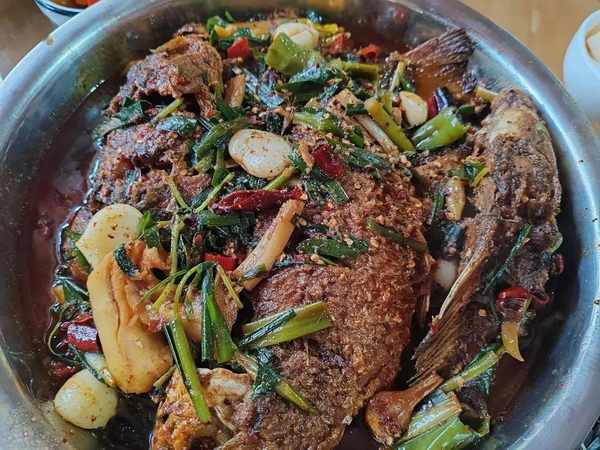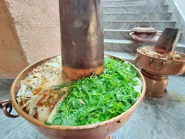 铜锅鱼,采用新鲜草鱼制作,汤汁鲜美,鱼肉鲜嫩,配上秘制蘸水,是到江川必吃的美食。
