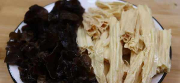 9、腐竹泡好后,挤出水份,浸泡过的木耳,用清水彻底清洗,与腐竹一同装入碗中。