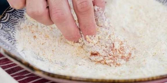 把腌制好的鸡胸肉在面粉里两面翻滚,让面粉均匀裹上。