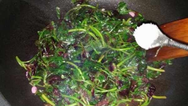 2,起锅烧油,放入蒜末爆香,然后再倒入苋菜翻炒均匀,炒至苋菜断生后,加入食盐调味,再加入清水大火烧开。