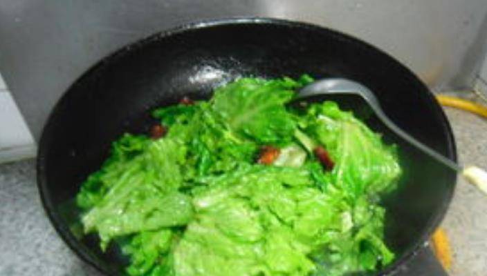 2,锅中加入食用油,油热后放入大蒜和辣椒爆香,然后加入生菜翻炒。