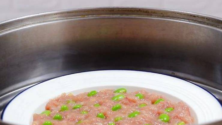2,接着,蒸锅中加入清水,大火烧开,再把调好味的肉馅放入盘中,将焯过水的毛豆米镶嵌在肉泥中,放入蒸锅内蒸制。