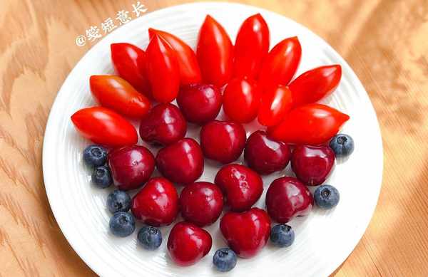 水果每次都买很多,所以每天的果盘都是几种水果混搭的,这样也可以摄入多种维生素。蓝莓对眼睛有好处,圣女果可以帮助防晒,樱桃中丰富的胡萝卜素和铁元素也能起到美容养颜的妙用。