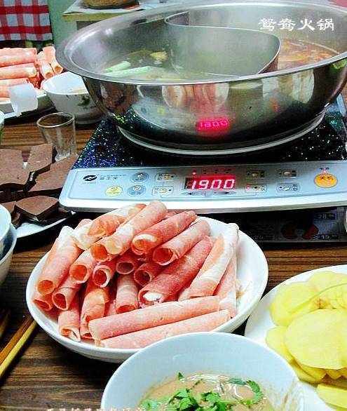 鸳鸯火锅是红油火锅同清汤火锅为一体的火锅,特别适合我家的口味,因为某人不吃辣,而我又不辣不欢,侄女和我一样也喜欢吃辣火锅,我家孩子两款都可以接受。哈哈,,,,个吃个的,互不干涉。。。对了,孩子大爷送来了紫皮土豆,切片加入辣锅里煮特别好吃,辣辣的,,,绵绵的。。