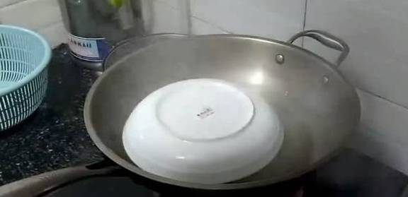 把碗放到盛有凉水的锅里,碗上盖上一个盘子,然后盖上锅盖后开火。大约五六分钟后就熟了。