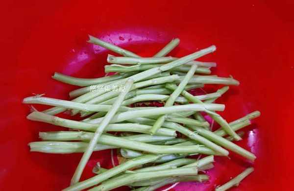 1.准备好的空心菜茎放在盆中,加入适量的水,食盐,放着浸泡会儿。经过浸泡可以更好地去除里面的脏东西。浸泡好的空心菜再用清水冲洗干净,洗净放在旁沥干水分;