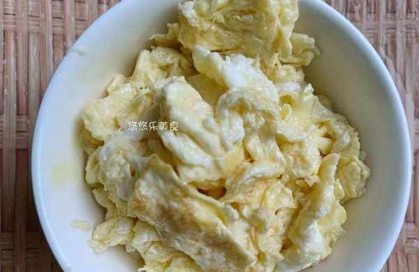 4.将锅中的鸡蛋液炒至成块,盛出放在碗中备用;