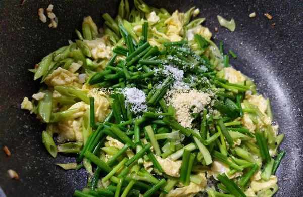 6.用铲子将锅中的食材翻炒均匀,放入切好的葱段,食盐,鸡精,铲子将锅中所有食材翻炒均匀。随后尝一下味道,可以的话就关火出锅。