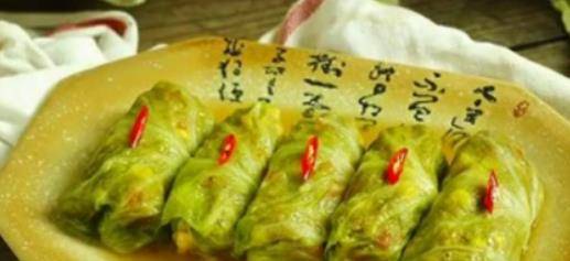 3、圆白菜叶包入炒熟的馅料,装盘即可。