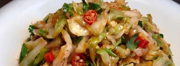 2、将蒜片、姜末、生抽、蚝油、白糖调匀成味汁,浇在圆白菜上拌匀,淋辣椒油即可。