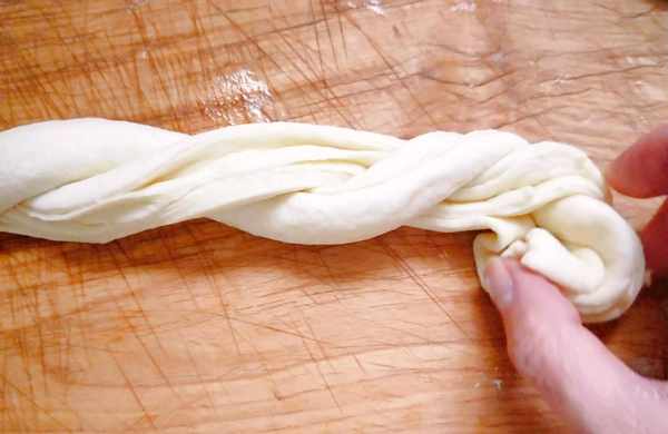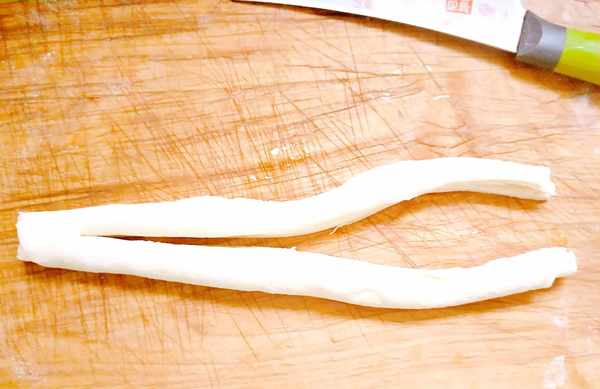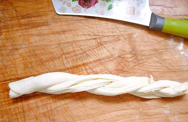 8,把两条面,像编辫子一样,来回一上一下的。弄好后,两手抓住均匀地再拧一下,上个劲。