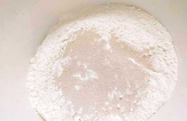 1,盆中加入适量的面粉和适量的酵母,面粉和酵母的比例是100克:1克,目测一下即可(一大袋酵母13克,一碗面粉也就500克),用筷子搅拌均匀。