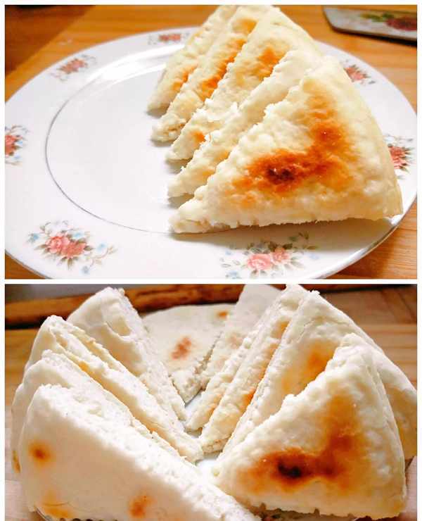5,我用奶锅烙的,小火,锅里滴入几滴食用油,用锅铲划拉开,放入饼胚,盖上锅盖,烙至一面定型,即可翻面盖住继续烙,勤翻几次,烙至用锅铲按压表面即刻弹起,说明饼熟透了。
