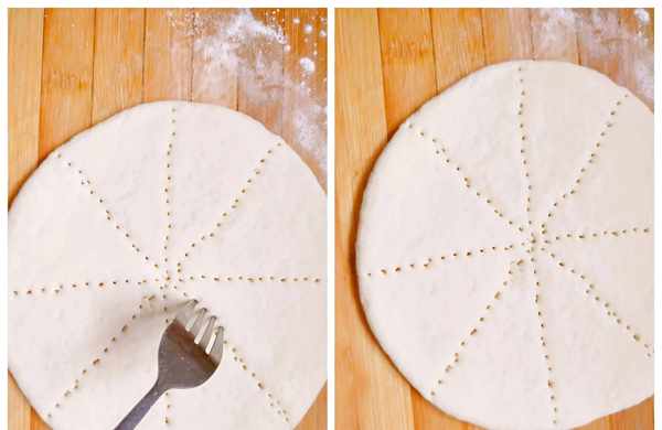 4,面发好后,面板上均匀撒些干面粉,把发面搓揉排气后,搓成均匀的长条,切成大小差不多大的剂子,压扁,擀成圆形薄饼,用叉子对角扎上眼。