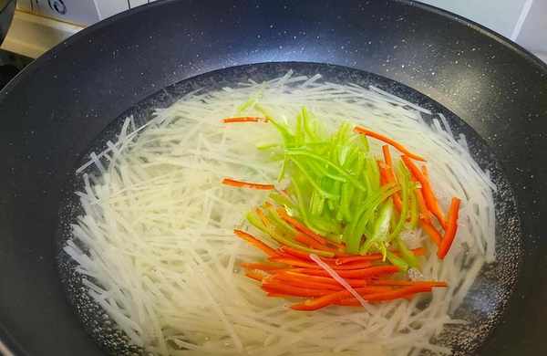 3、锅里烧水,水开以后加入少许盐和米醋,然后把土豆丝下锅,再次开锅以后加入青椒丝和红椒丝,再煮十秒钟马上捞出,把水分控干。