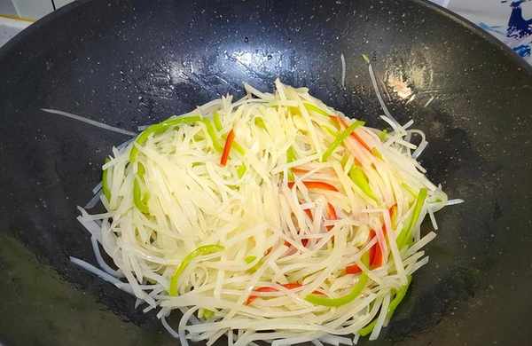 1、土豆丝一定要切得均匀,这样才能生熟一致。