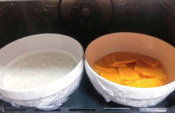 2、大黄米和糯米发酵好以后,先用清水洗净,再加入淹没过米的水,最后将100g南瓜切片,放在大黄米上,封好保鲜膜,上锅蒸40-50分钟。