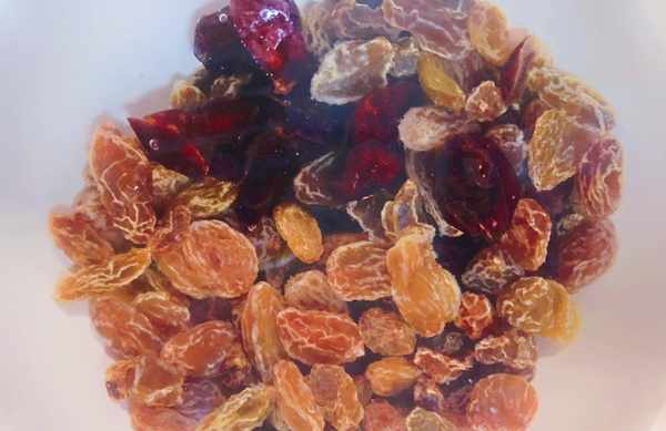 3、大黄米和糯米在蒸制的同时,将适量葡萄干和适量蔓越莓干泡软备用。