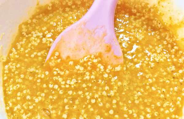 5、同样,在蒸好的大黄米中加入8g白糖,连同南瓜一并搅拌均匀备用。